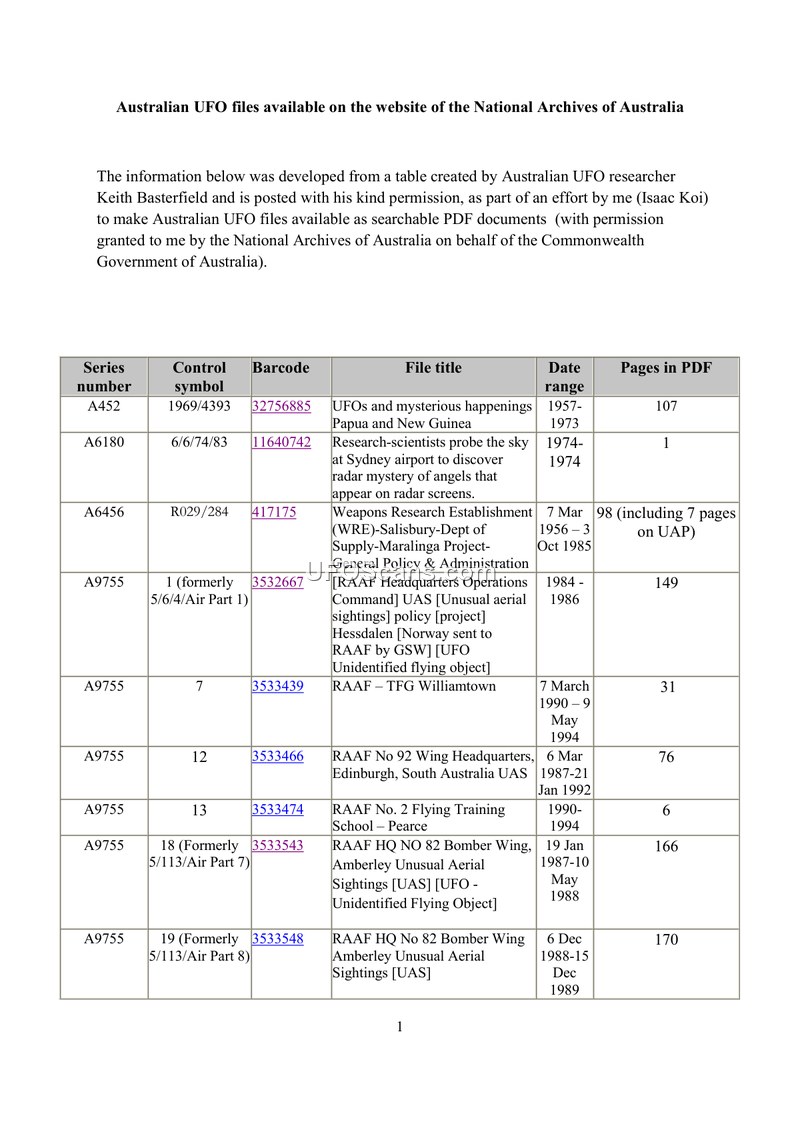 The information below was developed from a table created by Australian UFO researcher Keith Basterfield and is posted with his kind permission, as part of an effort by me (Isaac Koi) to make Australian UFO files available as searchable PDF documents