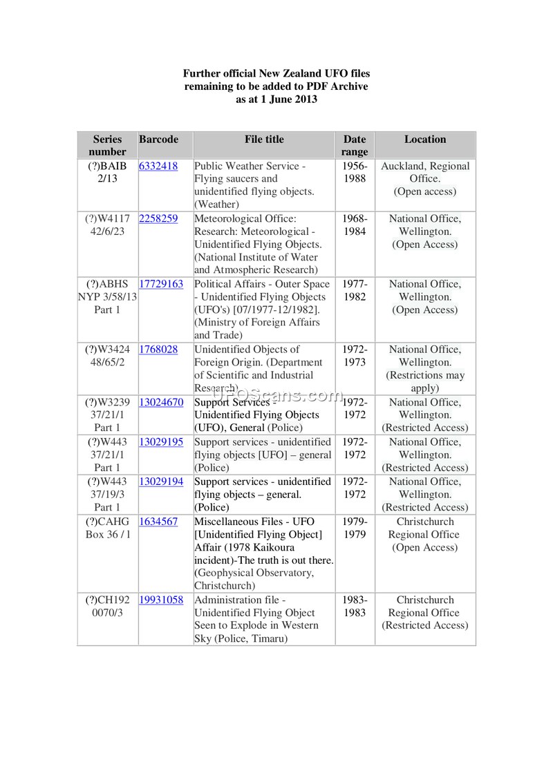 Further official New Zealand UFO files remaining to be added to PDF Archive as at 1 June 2013