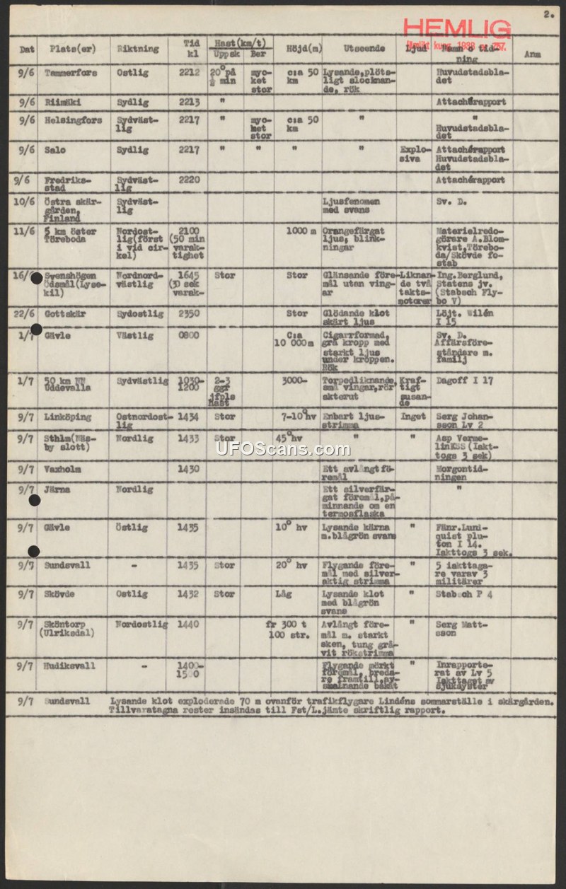 A classified log of aerial sightings in Finland and Sweden during June and July 1958. It includes reports from military personnel and a civilian pilot, culminating in an incident where an object exploded over a summer residence.
