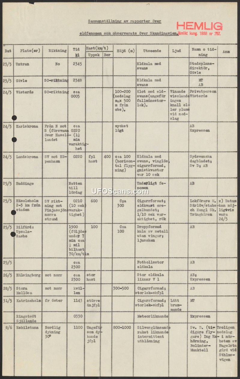 A classified Swedish military compilation of aerial fire phenomena reports observed across Scandinavia in May and June 1957. The document catalogs various sightings, including descriptions of fireballs, cigar-shaped objects, and potential crash sites.