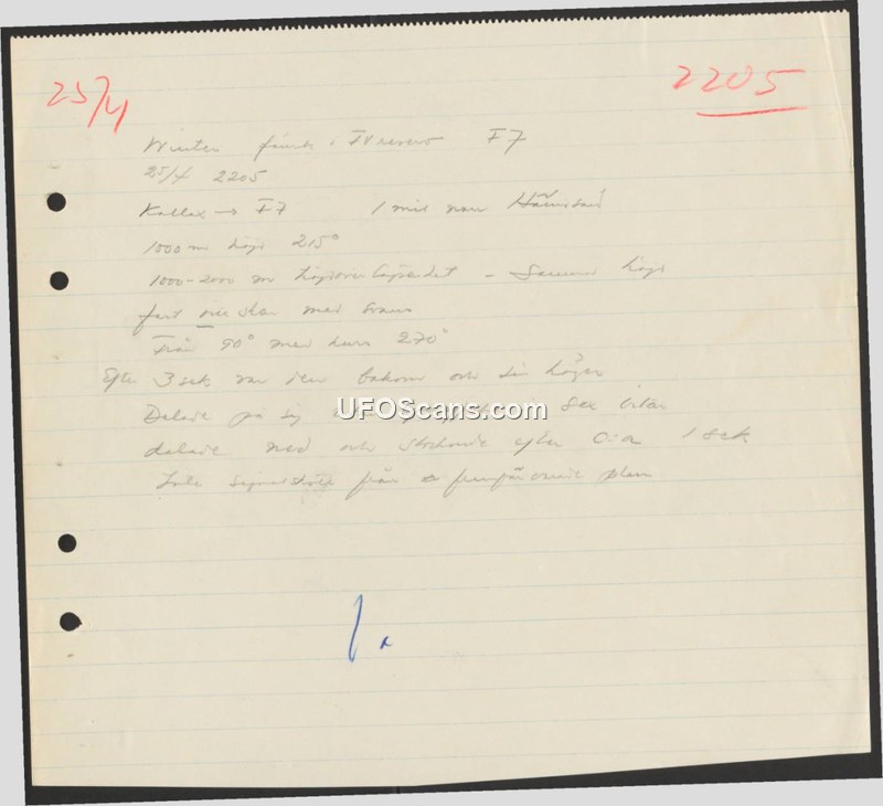 A handwritten report of an aerial sighting on April 25th involving an object that split into parts and emitted light. The event occurred during a flight between Kallax and F7.