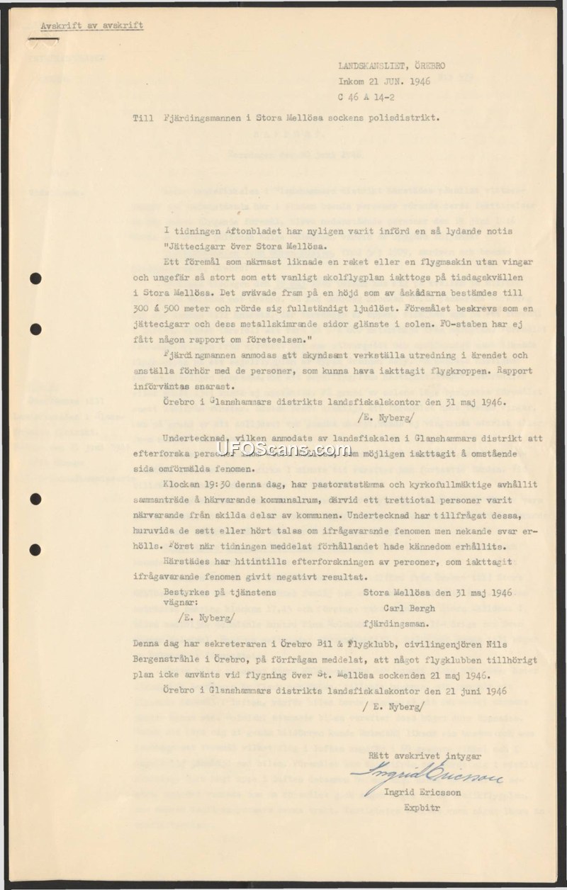 A 1946 Swedish police investigation into a reported 'giant cigar' UFO sighting over Stora Mellösa failed to find any witnesses or confirm the presence of aircraft in the area.