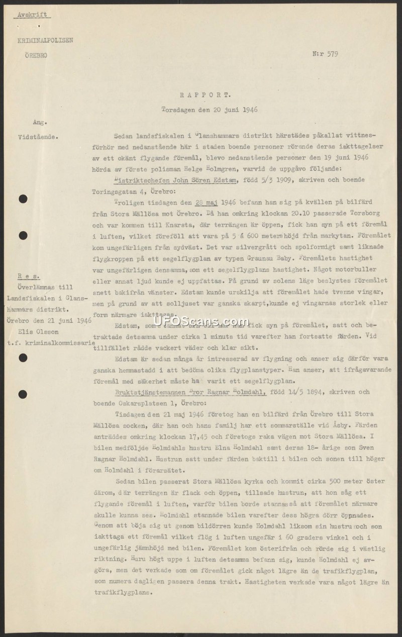 This police report, dated June 20, 1946, from the Criminal Police in Örebro, Sweden, documents witness testimonies regarding an unidentified flying object observed in May 1946. The report details two separate incidents involving local residents. The first witness, John Sören Edstam, a district manager, reported seeing an object on the evening of May 28, 1946, while driving from Stora Mällösa toward Örebro. Near Knarsta, he observed a silver-grey, spindle-shaped object at an altitude of approximately 500 to 600 meters. He noted that the object resembled the fuselage of a 'Grunau Baby' glider, moved at a speed consistent with a glider, and produced no engine noise. Due to the sun's position, he could discern two wings but could not determine their exact size or shape. Edstam, who identified himself as having a long-standing interest in aviation, concluded that the object was likely a glider. The second incident occurred on May 21, 1946, involving Bror Ragnar Holmdahl, his wife Elna, and their son Sven. While driving from Örebro toward Stora Mällösa, they stopped their vehicle near Stora Mällösa church after Elna spotted an object in the sky. Upon exiting the vehicle, the family observed an object flying at an angle of approximately 60 degrees, moving from east to west. Holmdahl noted that the object appeared to fly lower than the commercial aircraft that typically passed through the area and estimated its speed to be lower than that of commercial planes. The report was compiled by police officer Helge Holmgren and forwarded to the district prosecutor in Glanshammar.