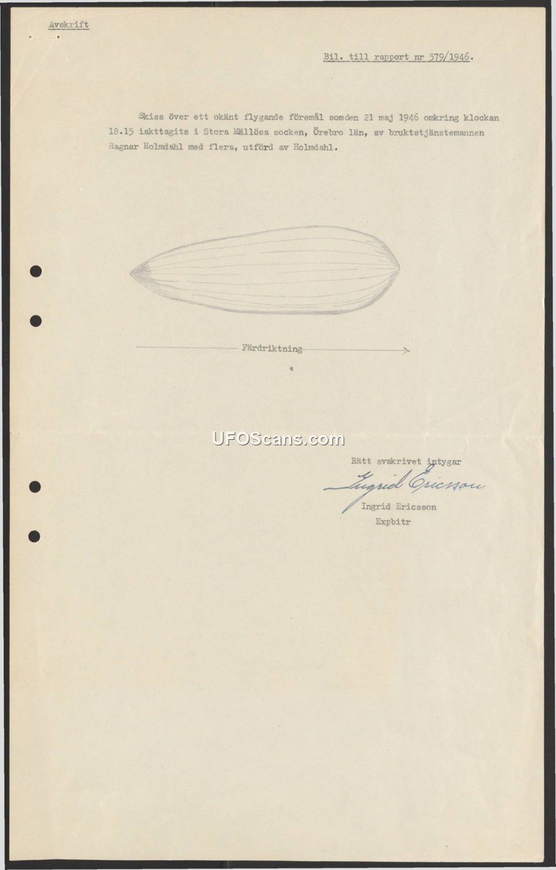 This document is a transcript and enclosure to report number 579/1946. It contains a sketch of an unknown flying object observed on May 21, 1946, at approximately 18:15. The sighting occurred in Stora Mällösa parish, Örebro county, Sweden. The primary witness, identified as Ragnar Holmdahl, who held the title of 'bruktstjänsteman' (a type of civil servant or official), was accompanied by others during the observation. Holmdahl himself produced the sketch of the object, which appears almond-shaped in the drawing. The document is certified as a correct transcript by Ingrid Ericsson, who holds the title of 'Expbitr' (Expedition Assistant).