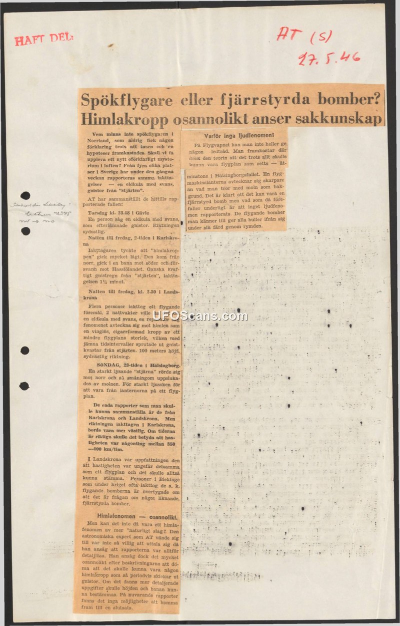 A 1946 Swedish newspaper report details multiple sightings of unidentified aerial objects described as fireballs or cigar-shaped craft. The Swedish Air Force could not identify the objects, and experts found the reports too vague for a definitive conclusion.