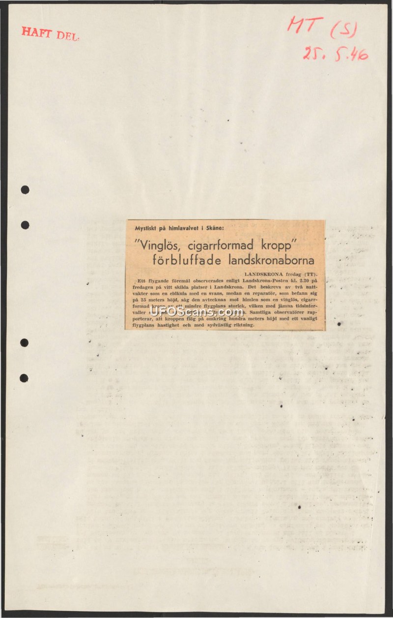 A press report from May 1946 details a sighting of a cigar-shaped, wingless aerial object in Landskrona, Sweden, observed by night watchmen and a repairman.