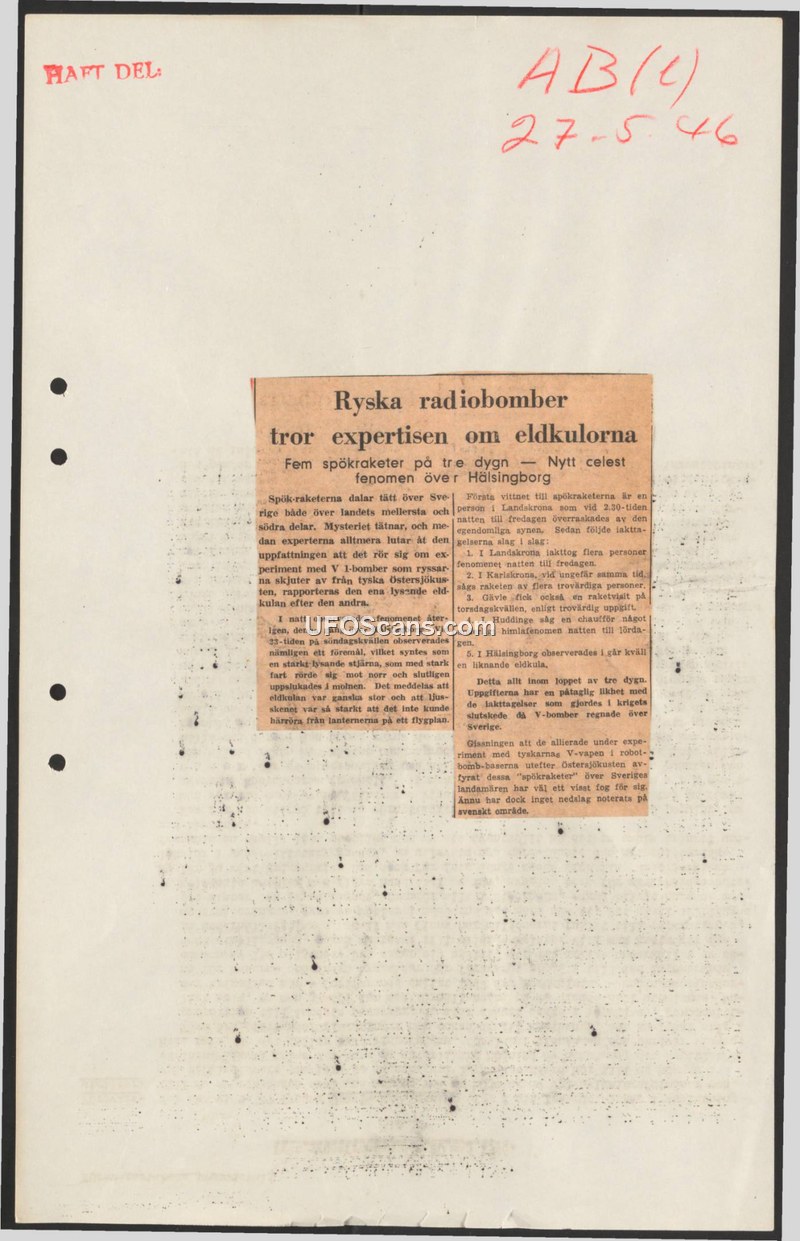 A 1946 newspaper report details multiple sightings of 'ghost rockets' over Sweden. Experts speculate these are Russian experiments with V-1 bombs launched from the German Baltic coast.