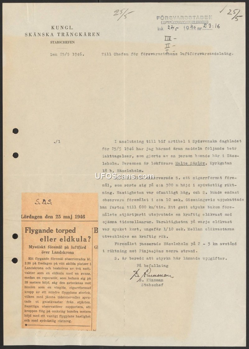 Report on Sighting of Unidentified Aerial Object in Hässleholm, May 1946