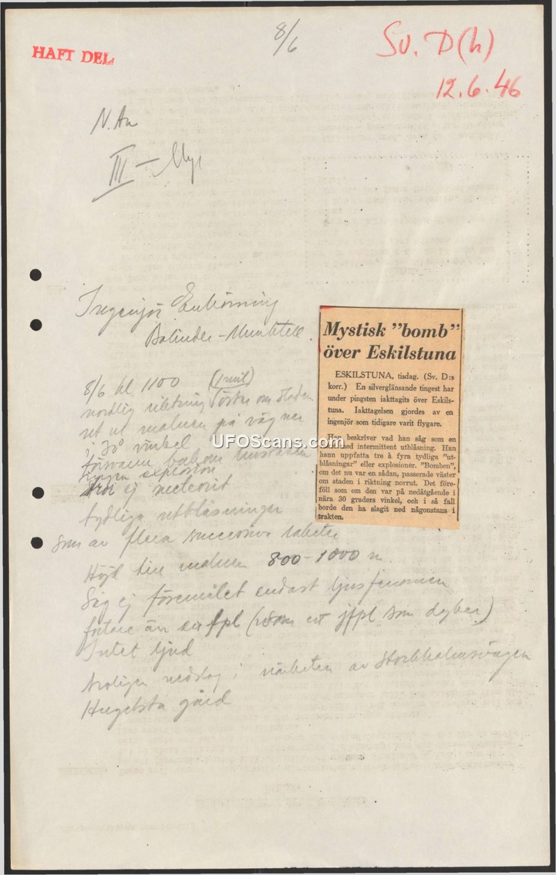 This document consists of a handwritten field report and a clipped newspaper article from the Swedish newspaper 'Sv. D.' dated June 12, 1946. The report details an incident occurring on June 8, 1946, at 11:00 hours. A witness, identified as an engineer and former pilot, observed a silver-shining object over Eskilstuna. The object was described as a rocket-like craft exhibiting intermittent exhaust or explosions. The witness estimated the altitude to be between 800 and 1000 meters. The object was observed passing west of the city, traveling in a northerly direction, and appeared to be descending at an angle of approximately 30 degrees. The witness reported that there was no sound associated with the object. The newspaper clipping corroborates the sighting, noting that the object was observed during the Pentecost holiday and that the witness was a former pilot. The report mentions the location of the sighting as being near the Stockholm road and Hugelsta gård.
