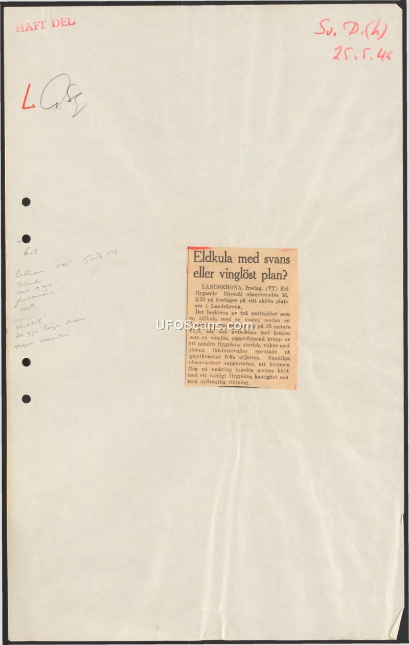 A press report from May 1946 details a sighting of a cigar-shaped, spark-emitting aerial object over Landskrona, Sweden. The object was observed by night watchmen and a repairman at low altitude.