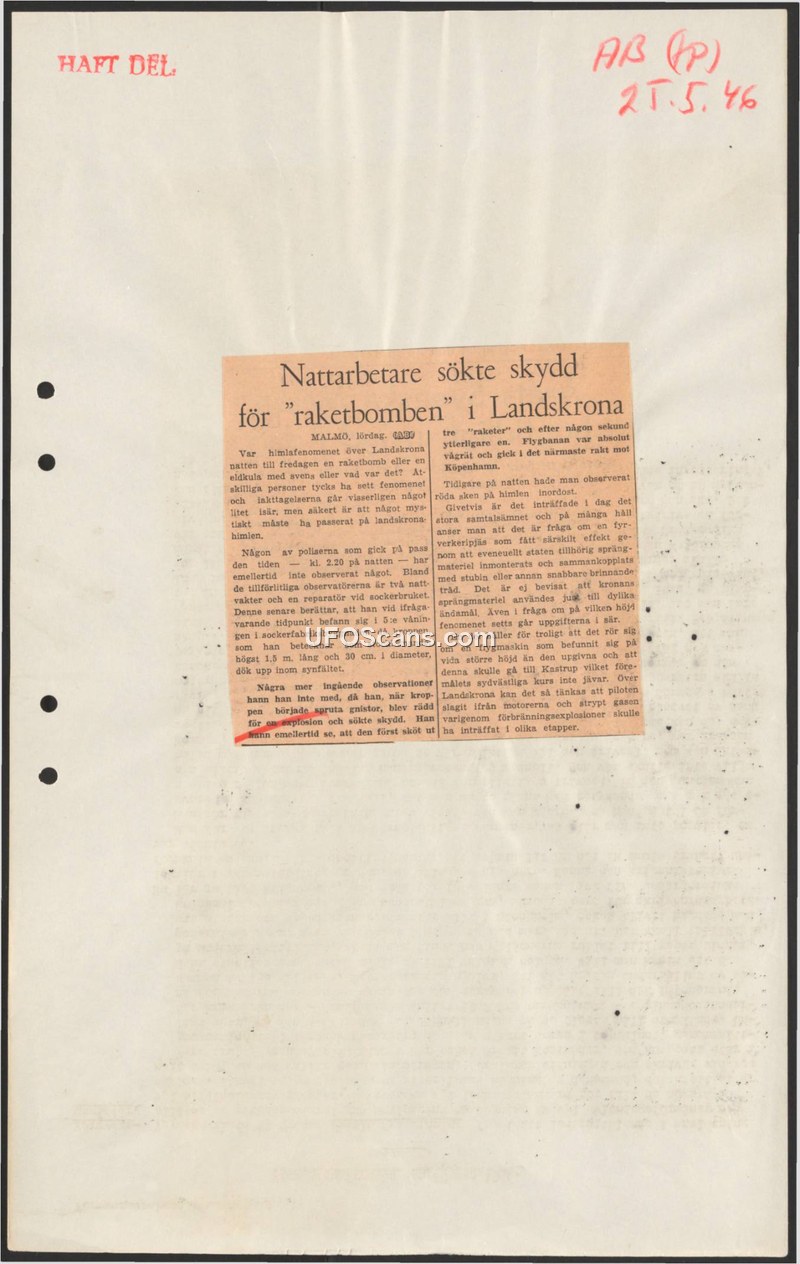 A newspaper report from May 1946 details a sighting of multiple 'rocket-like' objects over Landskrona, Sweden. Witnesses described the objects as stock-like, sparking, and moving horizontally toward Copenhagen.