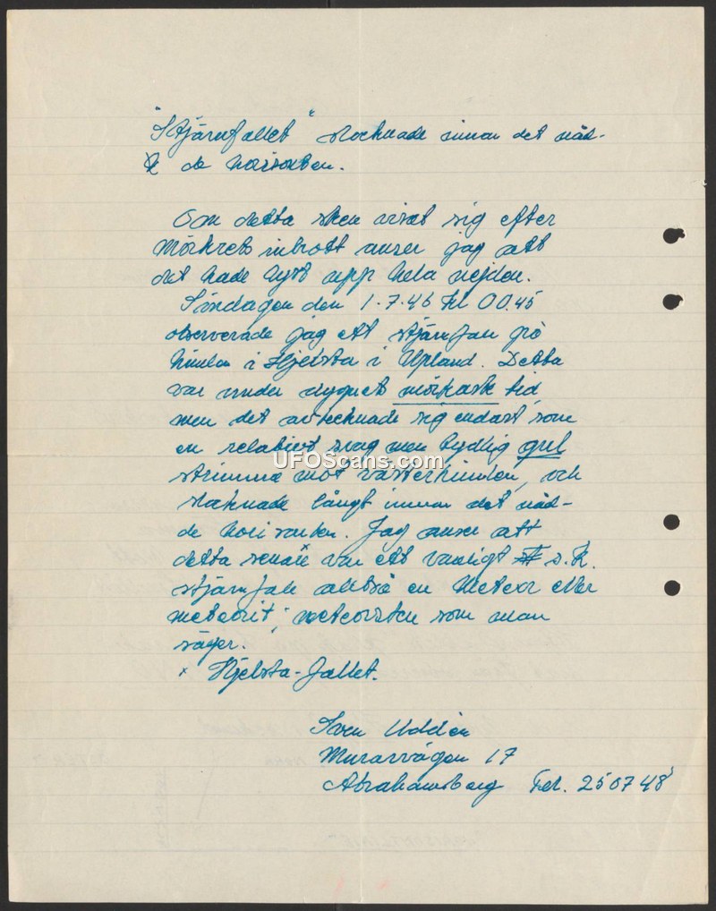 Sighting Report - Kjellsta, Uppland, Sweden, July 1, 1946