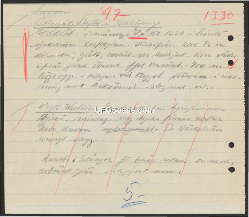 Handwritten notes documenting a sighting of a small, gray, unidentified object in Norrköping, Sweden, on August 7 at 13:30, which reportedly fell near Arkösund.