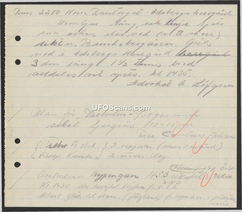 Handwritten notes documenting three separate sightings of unidentified aerial objects in Sweden, including descriptions of shape, size, and time of observation.