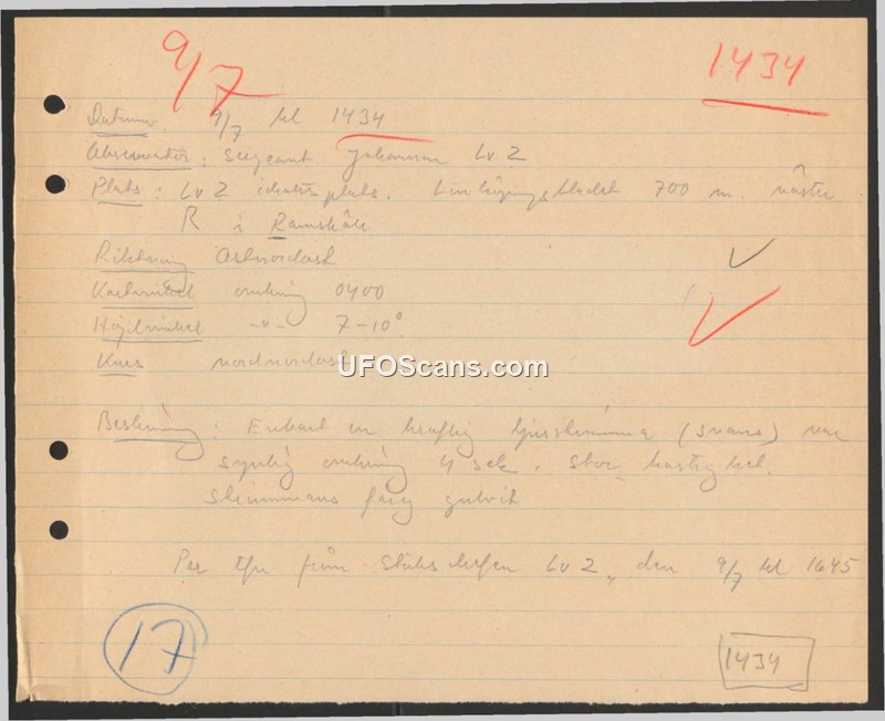 This document is a brief sighting report dated July 9, 1434. It records an observation made by a Sergeant at Lv 2 in Ramshäll. The witness observed a light phenomenon, described as having a tail, which was visible for approximately four seconds. The object was moving at a high speed at an altitude of 7-10 degrees, traveling in a north-northeasterly direction. The color of the light was described as yellow-white. The observation occurred at 0400 hours. A follow-up note indicates that the report was filed by the staff at Lv 2 on the same day at 1645 hours.