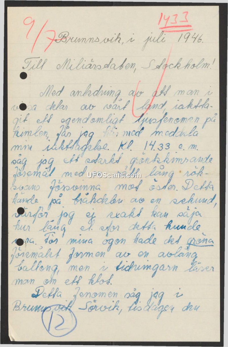 Sighting Report — Brunnsvik, Sweden, July 1946