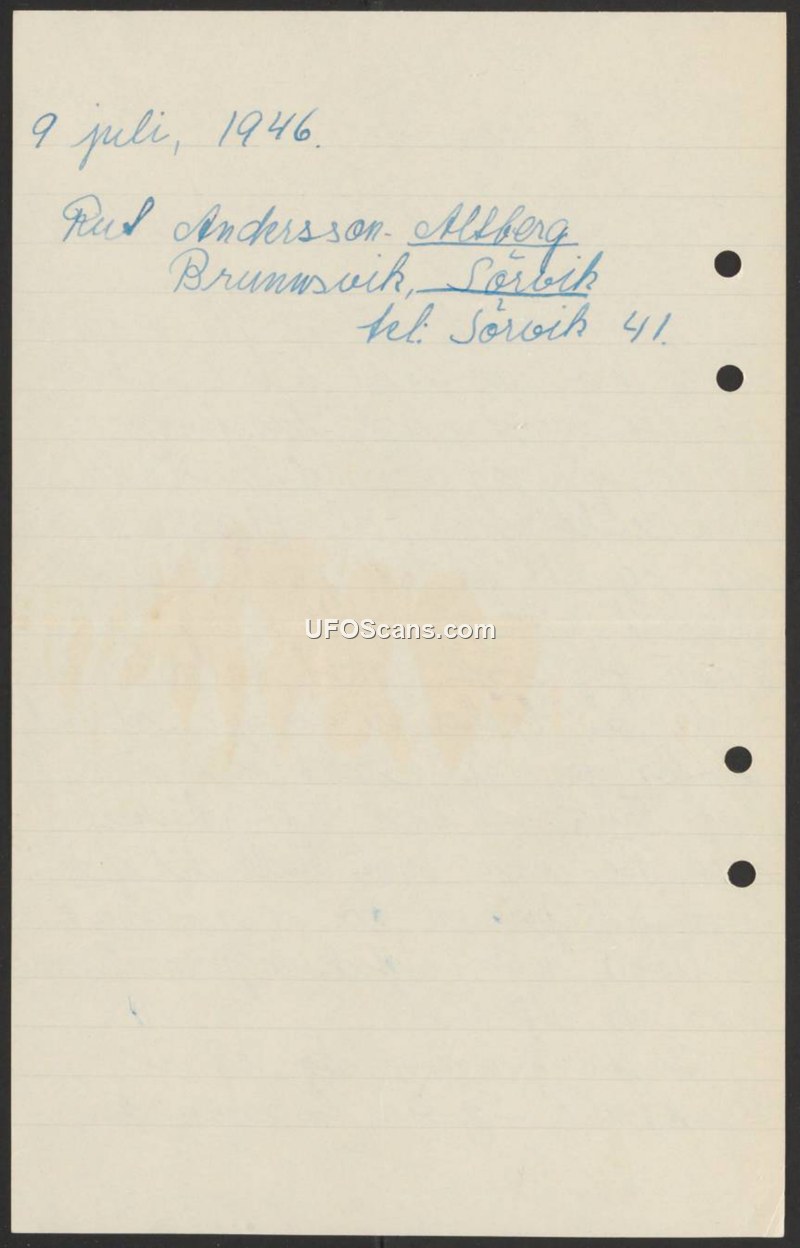 A handwritten note from July 9, 1946, documenting the contact information for an individual named Rud Andersson-Allberg in Sörvik, Sweden.