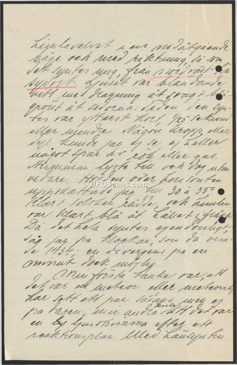 A brief, handwritten account of an aerial sighting in Sweden at 14:34. The witness describes a short-lived, bright object and speculates it may have been a jet condensation trail.