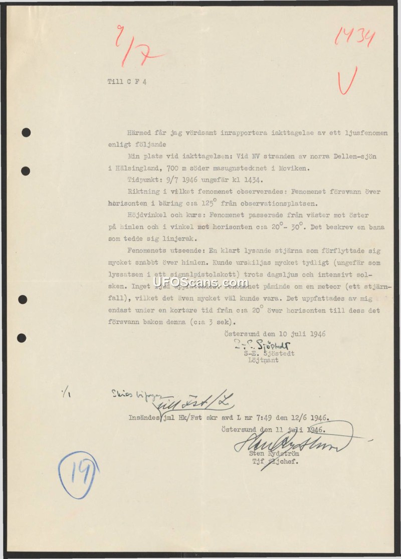On July 10, 1946, Lieutenant S-E. Sjöstedt submitted a formal report to C F 4 regarding an aerial phenomenon observed on July 9, 1946, at approximately 14:34. The witness was located on the northwest shore of the northern Dellen lake in Hälsingland, specifically 700 meters south of the blast furnace sign in Moviken. Sjöstedt described the object as a clearly shining star that moved very rapidly across the sky from west to east. Despite the presence of daylight and intense sunshine, the object was clearly visible, with the witness comparing its brightness to the flare of a signal pistol. The object followed a linear path at an angle of 20 to 30 degrees to the horizon. No sound was heard during the event. The witness noted that the phenomenon resembled a meteor, or shooting star, and acknowledged that this was a likely explanation. The object was observed for approximately three seconds before it disappeared behind the horizon at a bearing of approximately 125 degrees from the observation point. The report includes a mention of an attached sketch and references a document from the Swedish Defence Staff (Hk/Fst) numbered L 7:49, dated June 12, 1946. The document was signed by Sjöstedt and later processed by Sten Rydström.