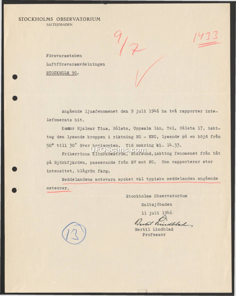 The Stockholm Observatory reported to the Swedish Air Defense Department that two sightings of a light phenomenon on July 9, 1946, were consistent with meteors.