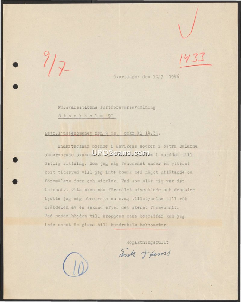This document is a formal report submitted to the Air Defense Department of the Swedish Defense Staff (Försvarsstabens luftförsvarsavdelning) in Stockholm. The report, dated July 10, 1946, concerns a light phenomenon observed on July 9, 1946, at approximately 14:33. The witness, Erik Hams, a resident of Envikens socken in the Dalarna region, describes observing an object moving from a northeast to an easterly direction. Due to the extremely short duration of the sighting, the witness states he cannot provide an opinion regarding the object's shape or size. He emphasizes the intensity of the white light emitted by the object and notes that he observed a faint trace of smoke a fraction of a second after the light vanished. Regarding the altitude of the object's trajectory, the witness estimates it to be in the hundreds of hectometers.
