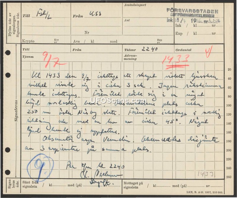 A Swedish military report documenting the sighting of a bright violet object on July 2nd at 1433 hours. The object moved at a sharp angle and could not be identified by the three witnesses present.
