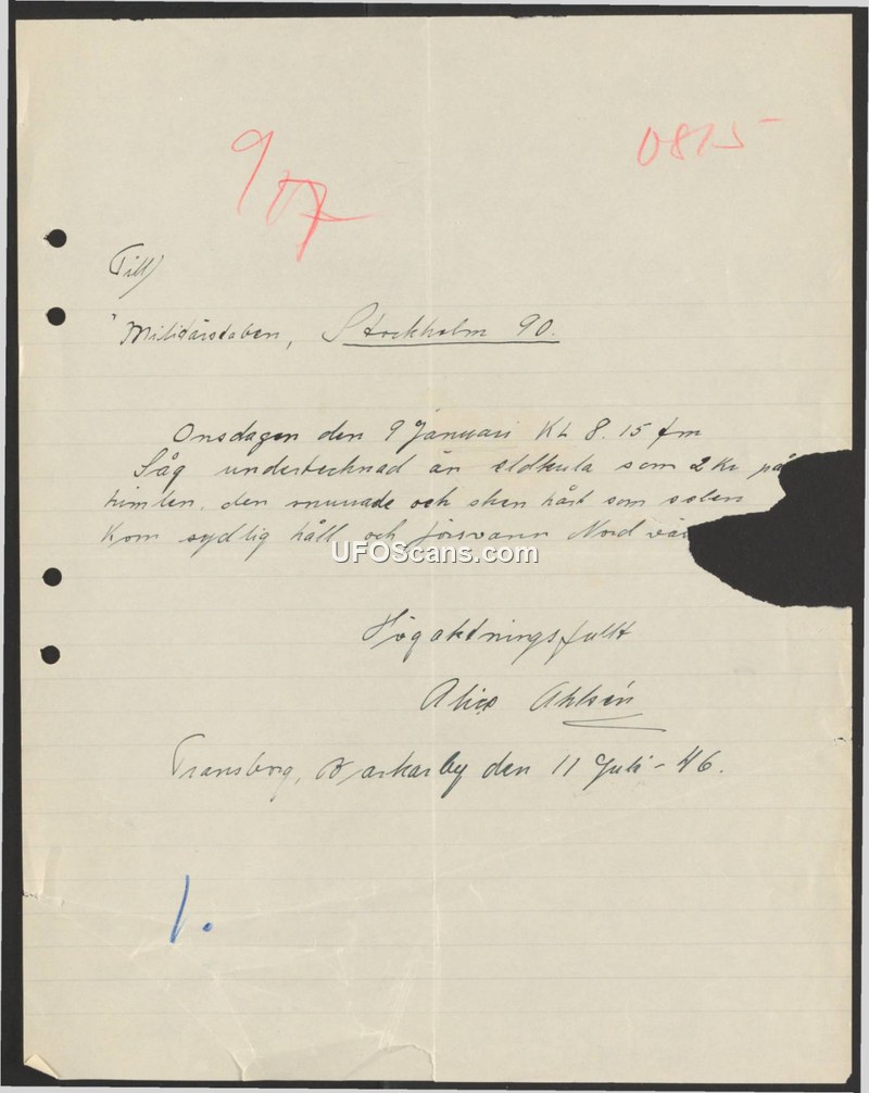 A witness report submitted to the Swedish Military Staff regarding a bright fireball observed over Stockholm on January 9, 1946. The object was described as shining as brightly as the sun while moving from the south to the north-west.