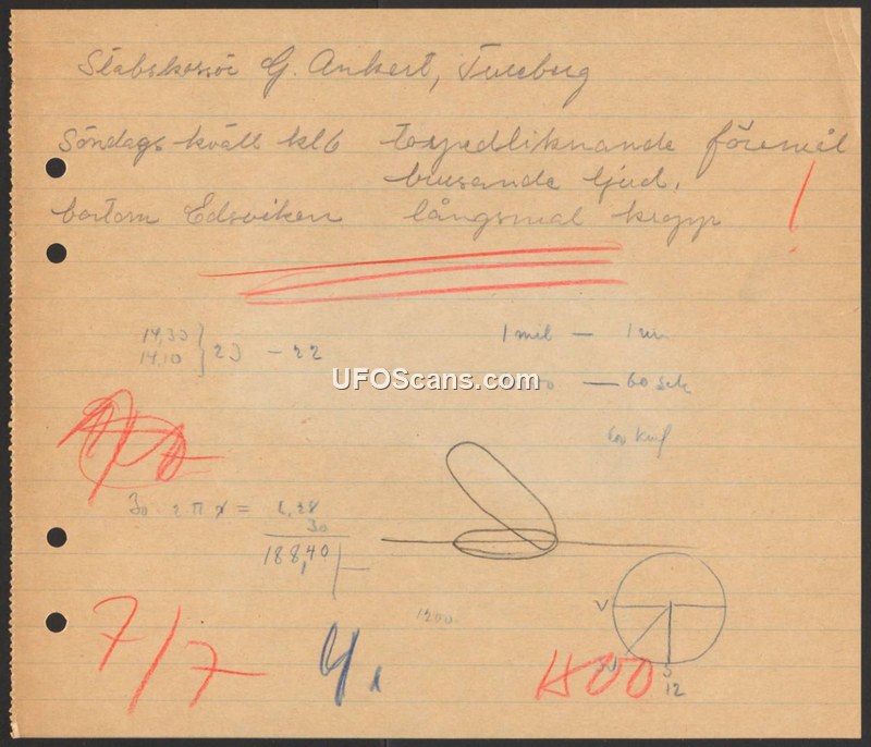 This document is a brief, handwritten field note documenting a sighting reported by Stabskonstabel G. Ankert. The incident occurred on a Sunday evening at 18:00 hours. The witness observed a torpedo-like object moving slowly behind Edsviken. The report notes that the object produced a buzzing sound. The document also contains various mathematical calculations and a sketch of the object's trajectory or appearance, though these notes are not fully explained in the text.