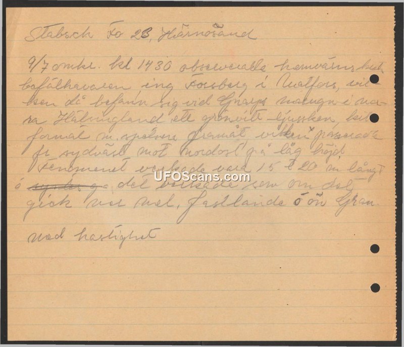 A Home Guard commander reported observing a green, 15-20 meter long object flying at low altitude over Gnarp, Sweden, on July 9 at 14:30.