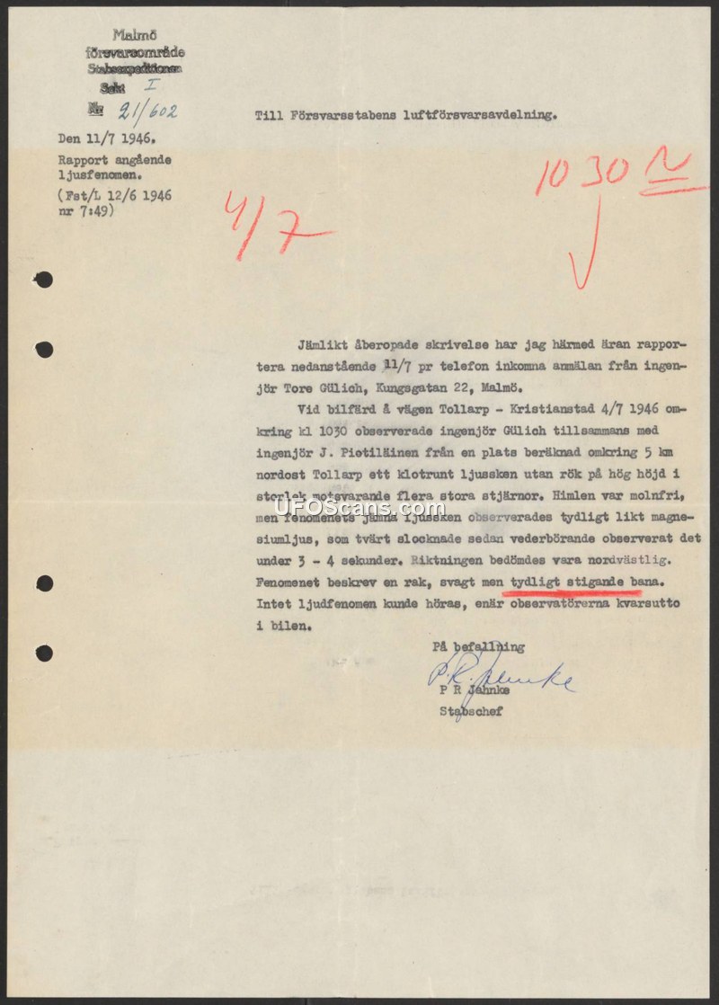 Rapport angående ljusfenomen (Report regarding light phenomenon) — Malmö, 11 July 1946