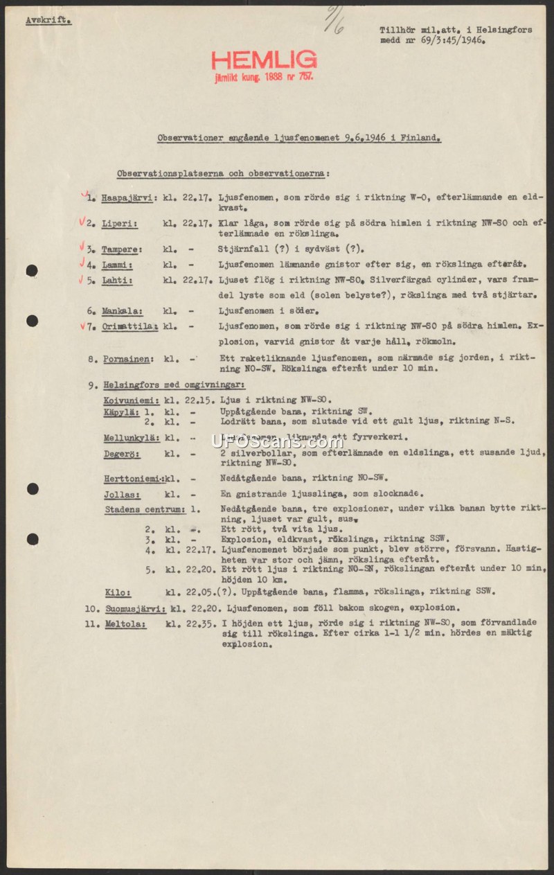 A classified 1946 Finnish report documenting multiple sightings of unidentified aerial phenomena across the country on June 9, 1946. The sightings describe various light phenomena, including cylinders and spheres, often accompanied by smoke trails, explosions, and specific flight patterns.