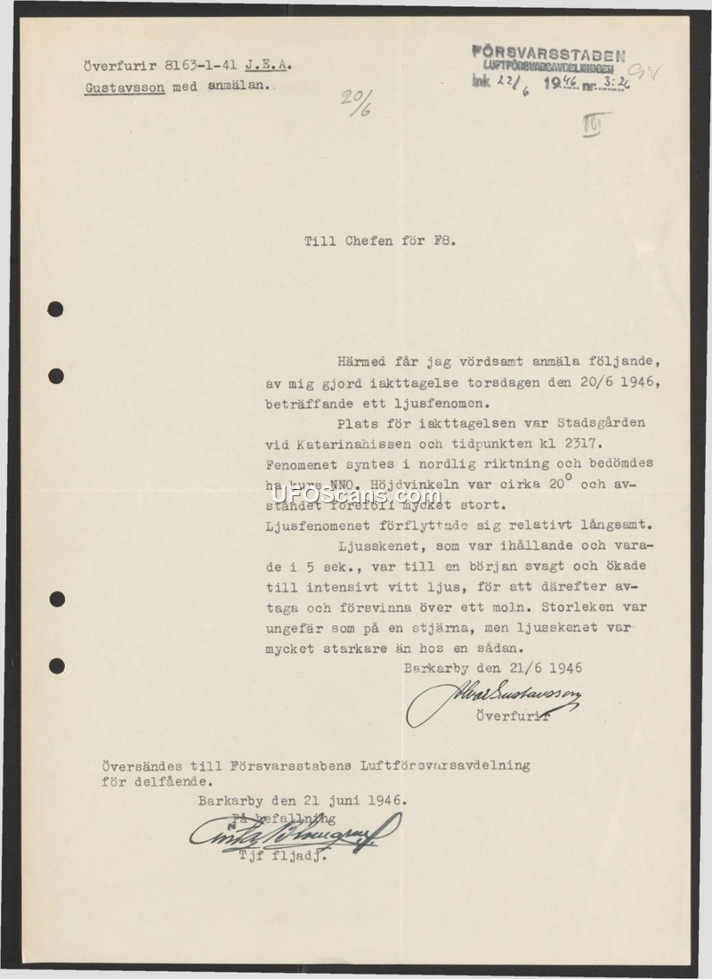 On June 21, 1946, an individual identified as Överfurir Gustavsson submitted a formal report to the Chief of F8 regarding a light phenomenon observed the previous night. On June 20, 1946, at 23:17, Gustavsson observed a light phenomenon while at Stadsgården, near the Katarinahissen. The object was seen in a northern direction with a heading of NNO. The witness estimated the elevation angle to be approximately 20 degrees and noted that the distance to the object appeared to be very great. The phenomenon moved relatively slowly. The light was described as lasting for five seconds; it began weakly, increased to an intense white light, and subsequently faded away over a cloud. While the size of the object was estimated to be comparable to a star, the witness noted that the light itself was significantly brighter than that of a star. The report was subsequently forwarded to the Air Defense Department of the Defense Staff for their information.