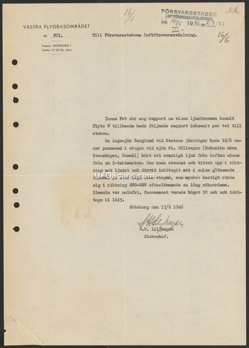 This document is a report issued by the Västra flygbasområdet (Western Air Base Area) on June 17, 1946, addressed to the Air Defense Department of the Swedish Defense Staff. It details a sighting reported by an engineer named Berglund, employed by the Swedish State Railways (Statens järnvägar). On June 16, 1946, at 16:45, while walking in the woods near Lake St. Hällungen in Bohuslän (near Svenshögen and Ödsmål), Berglund heard an unusual sound from the air, described as resembling a two-stroke engine. Upon looking up, he observed a shiny object at a high altitude. The object lacked wings and moved very rapidly in a direction from south-southeast to north-northwest (SSO-NNV), leaving behind a long trail of smoke. The sky was cloudless at the time, and the entire event lasted no more than 30 seconds. The report was signed by S.H. Liljhagen, Chief of Staff.