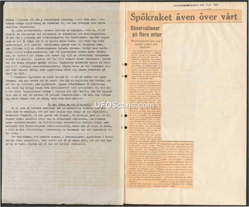 A June 1946 newspaper report details widespread sightings of 'ghost rockets' across Finland. Witnesses describe high-speed, light-emitting objects, with experts debating whether they are meteors or advanced technology.