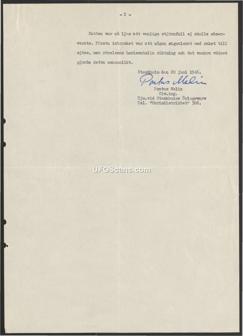 This document is a brief report dated June 20, 1946, authored by Pontus Melin, a civil engineer at the Stockholm Naval Shipyard (Stockholms Örlogsvarv). The report describes an aerial observation made under conditions where the night sky was exceptionally bright, rendering typical shooting stars invisible. The author notes that the initial impression was that someone had fired a signal rocket at sea. However, the author explicitly rejects this conclusion, citing the horizontal trajectory of the object and the clear weather conditions as factors that made the signal rocket hypothesis unlikely. The document serves as a contemporary account of an unidentified aerial phenomenon observed in Stockholm during the summer of 1946.