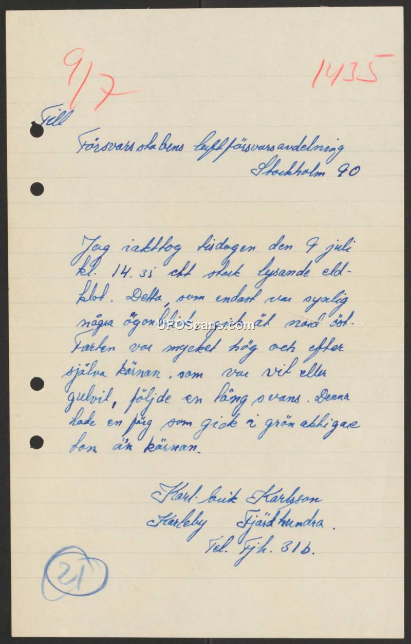 On July 9, 1950, at 14:35, Karl-Erik Karlsson of Fjärdhundra, Sweden, observed a luminous object in the sky. The witness described the object as a strong, glowing fireball that was visible for only a few moments. The object was traveling in a northeasterly direction at a very high altitude. Karlsson noted that the core of the object appeared white or yellowish, and it was followed by a long tail that was greenish in color. The report was addressed to the Air Defense Department of the Defense Staff in Stockholm.