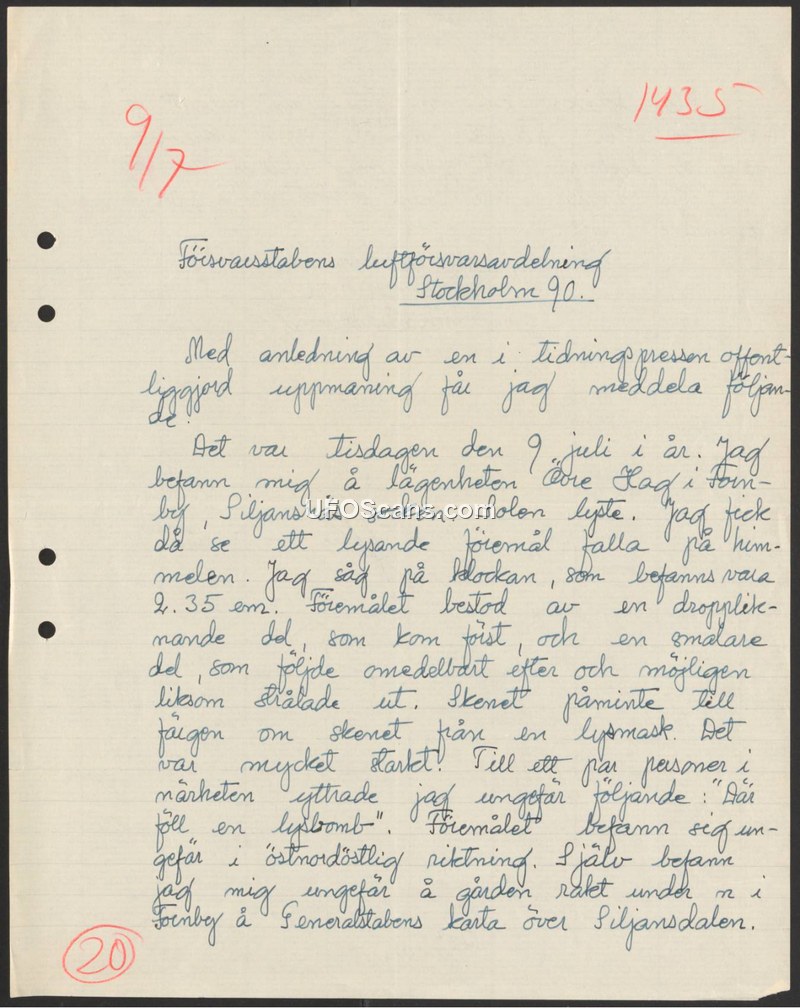 A witness report from July 9, 1957, detailing the observation of a luminous, droplet-shaped object falling from the sky over Fornby, Sweden. The witness described the object as having a very strong light.
