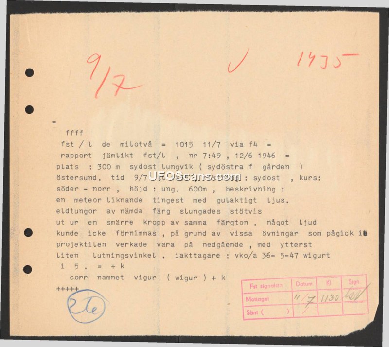 A Swedish military report from 1946 details a sighting of a yellowish, meteor-like object near Östersund. The object was observed descending at a slight angle while ejecting flames, though no sound was heard due to local military exercises.