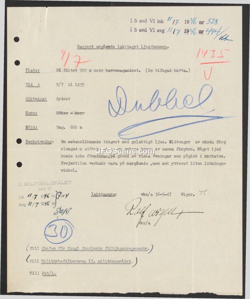 A military report from 1946 detailing the sighting of a descending, flame-emitting, yellowish light phenomenon observed by Rolf Wigur near an oat warehouse in Sweden.