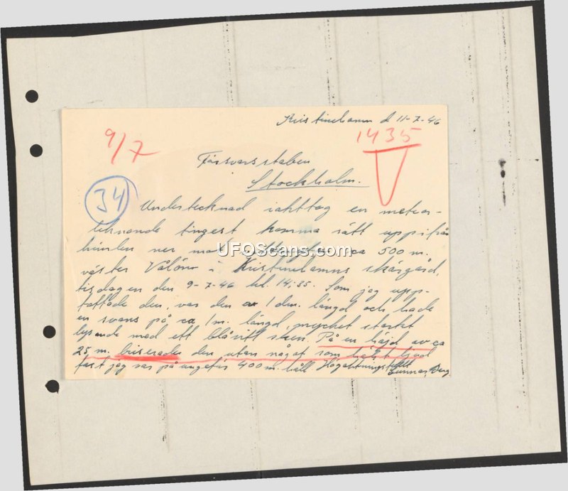 Sighting Report — Stockholm, Sweden, July 9, 1946
