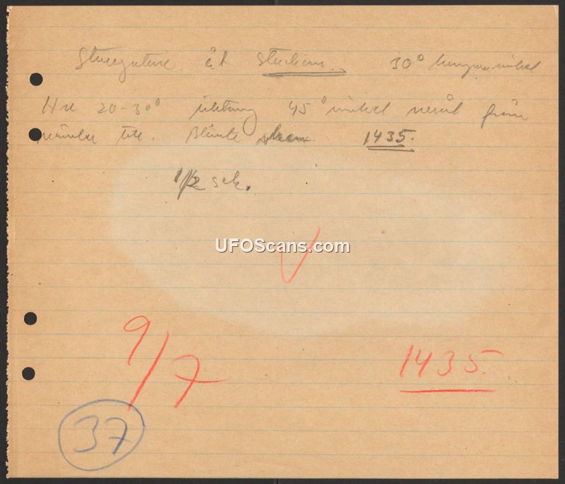 The document records a brief observation of an object at 1435 hours on July 9th, noting specific angular changes over a duration of half a second.