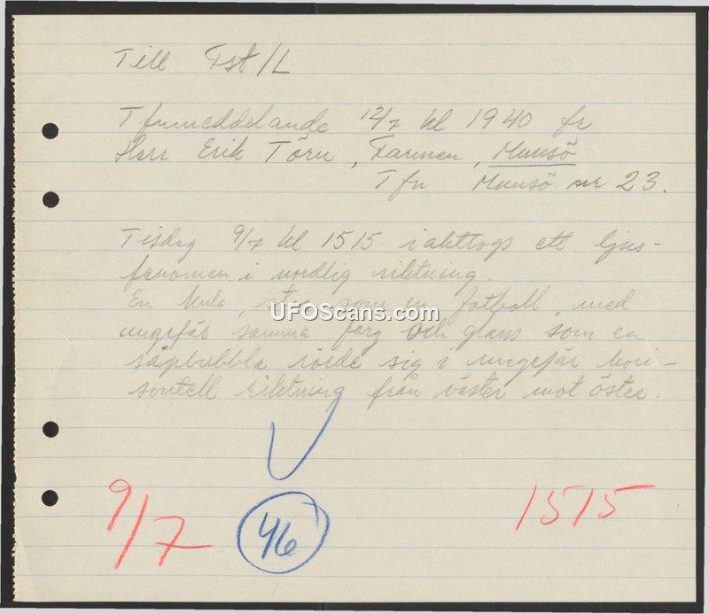 Sighting Report — Mansö, Sweden, July 1947