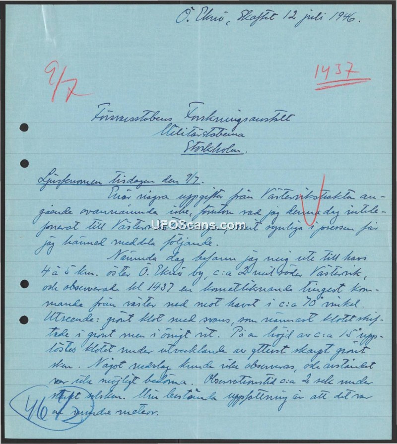 Sighting Report — O. Chris, Sweden, 12 July 1946