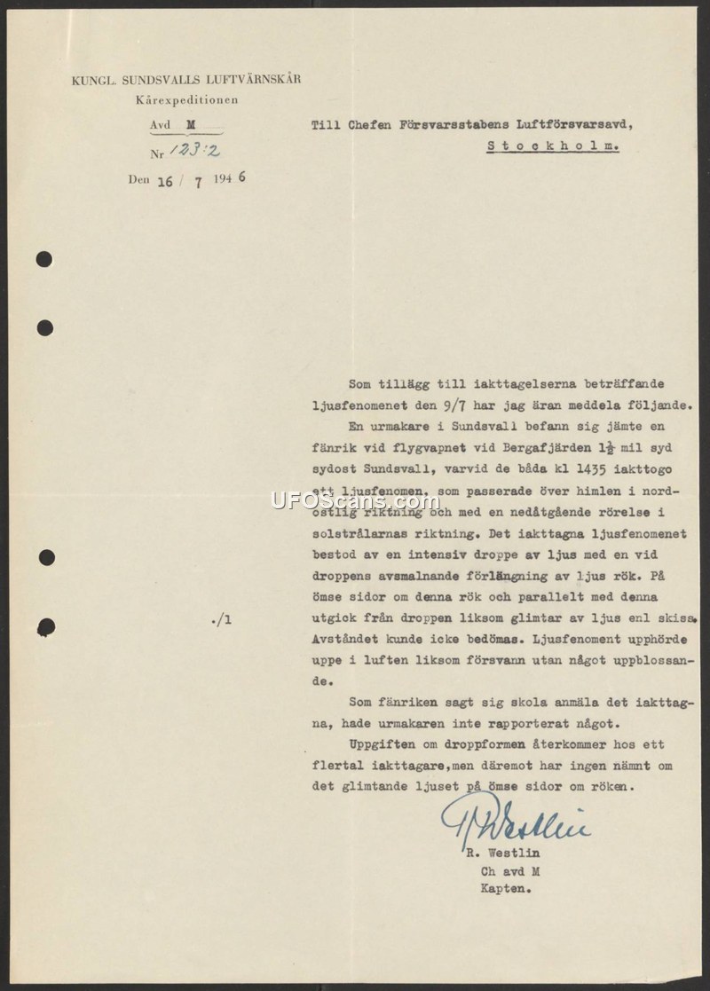 Report on Light Phenomenon Sighting — Sundsvall, Sweden, July 9, 1946