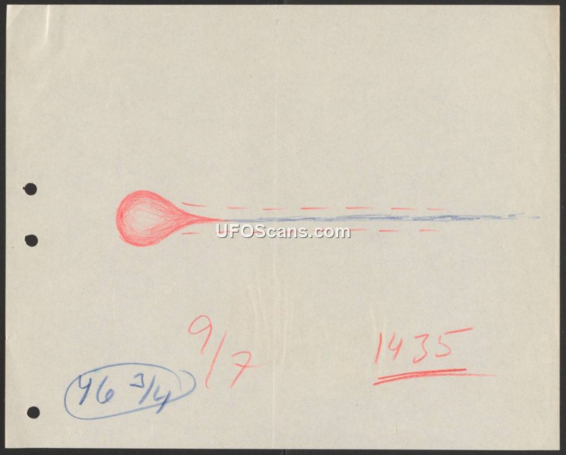 The document consists of a single page containing a hand-drawn sketch of an unidentified aerial object. The object is rendered with a red, circular head and a blue, linear tail. Dashed red lines flank the tail, suggesting a wake or trail effect. The page also contains handwritten numerical notations, including '1435' and '9/7', as well as a circled '46 3/4'. There is no accompanying text or descriptive narrative to provide context for the drawing.