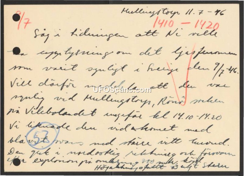 A witness report from July 1946 describing an aerial object seen over Mullingstorp, Sweden. The object was described as a blue mass with a red head that disappeared after an explosion.