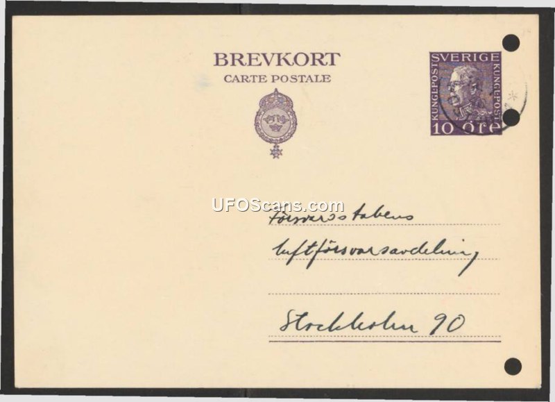 This is a blank postal card addressed to the Swedish Defense Staff's Air Defense Department in Stockholm. It contains no correspondence or incident details.
