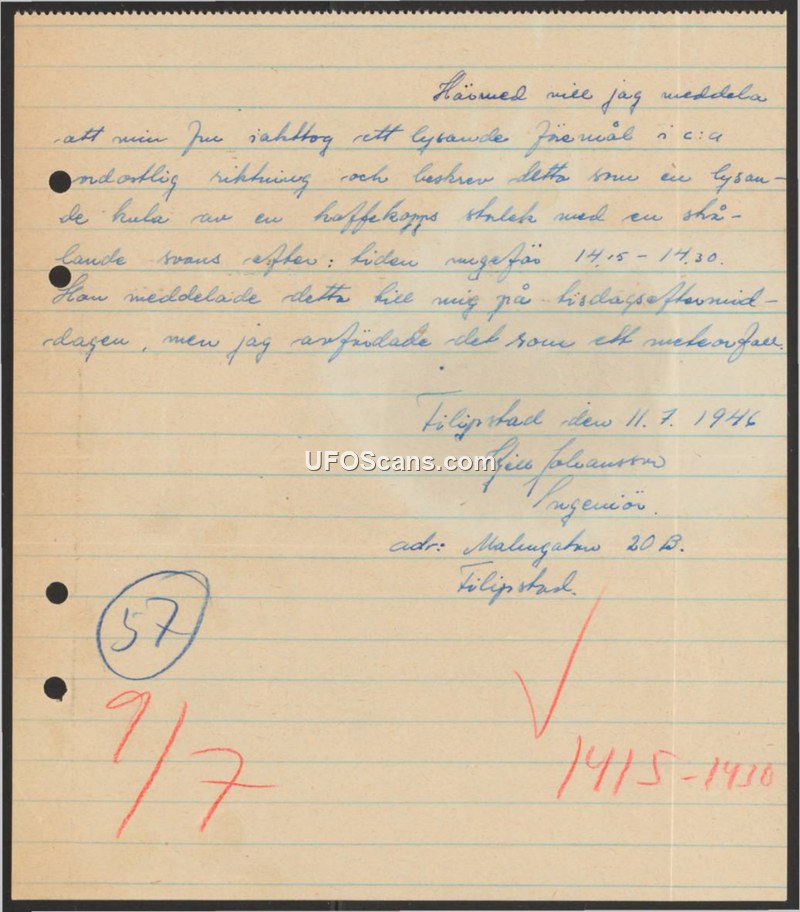 A 1946 report from Filipstad, Sweden, detailing a sighting of a luminous, tail-bearing object described as the size of a coffee cup. The witness, an engineer, initially categorized the event as a meteor.