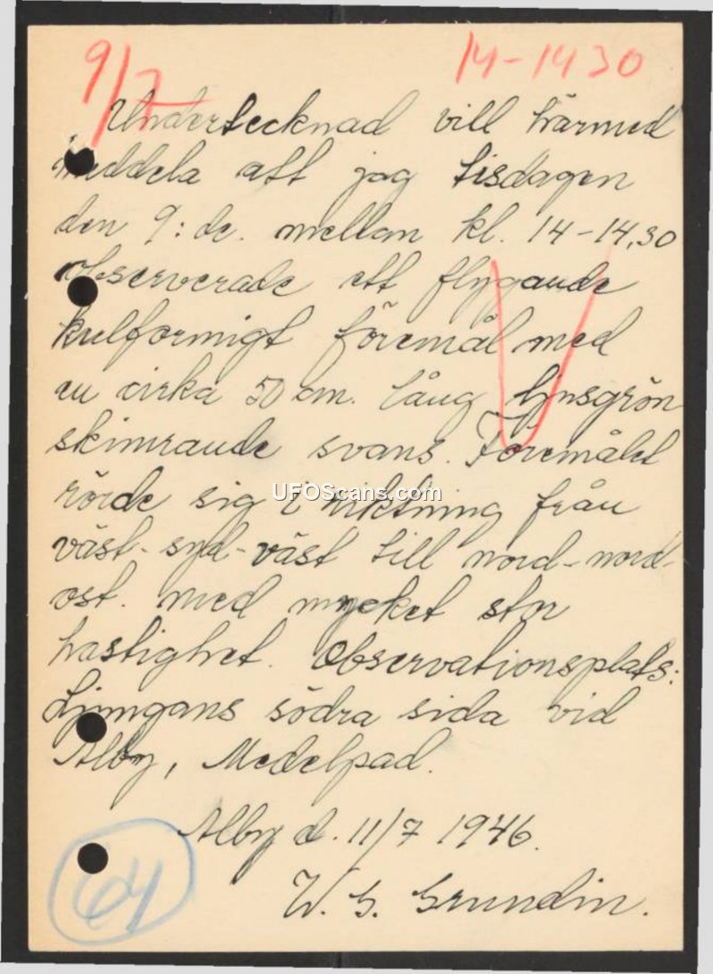 Sighting Report — Alby, Medelpad, July 9, 1946