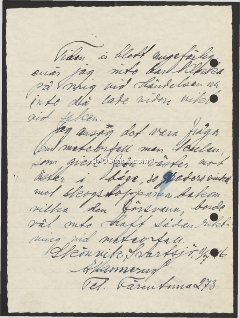 Jag ansåg det vara fråga om meteorfall men delen, som gick från väster mot öster i båge, så [illegible] vinkel mot skogstopparna bakom vilka den försvann, borde väl inte haft sådan riktning vid meteorfall.